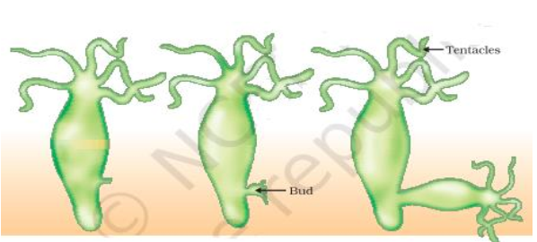 Draw labelled diagrams to show different stages of budding in Hydra.