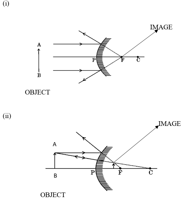 Draw ray diagrams to show the nature, position and relative size of the image formed by a convex mirror when the object is placed (i) at infinity and (ii) between infinity and pole P of the mirror.