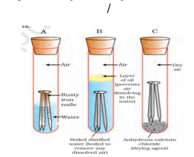- Put some anhydrous calcium chloride in test tube C and corkit. Anhydrous calcium chloride will absorb the moisture, ifany, from the air.Iron nails rust in test tube A, but they do not rust in test tubes B and C.Rusting of iron takes place when exposed to both air and water.