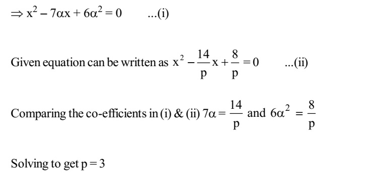 Quadratic Equations (10)Find the value of p, for which one root of the quadratic equation $px^2 - 14x + 8 = 0$ is 6 times the other.