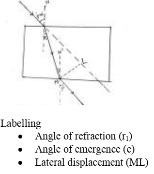 Light (10)Draw the path of a ray of light when it enters one of the faces of a glass slab at an angle of nearly 45°. Label on it (i) angle of refraction, (ii) angle of emergence and (iii) lateral displacement.