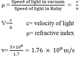 The absolute refractive index of Ruby is 1.7. Find the speed of light in Ruby. The speed of light in vacuum is 3 x 108 m/s.