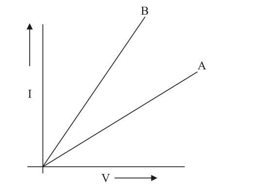 Electricity (10)Two V - I graphs A and B for series and parallel combinations of two resistors are as shown. Giving reason state which graph shows (a) series, (b) parallel combination of the resistors.